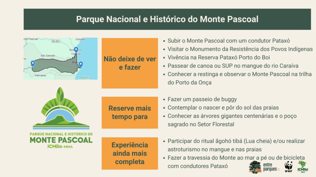 - Folder com mapa de visitação: https://www.gov.br/icmbio/pt-br/assuntos/biodiversidade/unidade-de-conservacao/unidades-de-biomas/mata-atlantica/lista-de-ucs/parna-e-historico-do-monte-pascoal/informacoes-sobre-visitacao-parna-e-historico-do-monte-pascoal/arquivos/folder-uso-publico-pnhmp_compressed.pdf