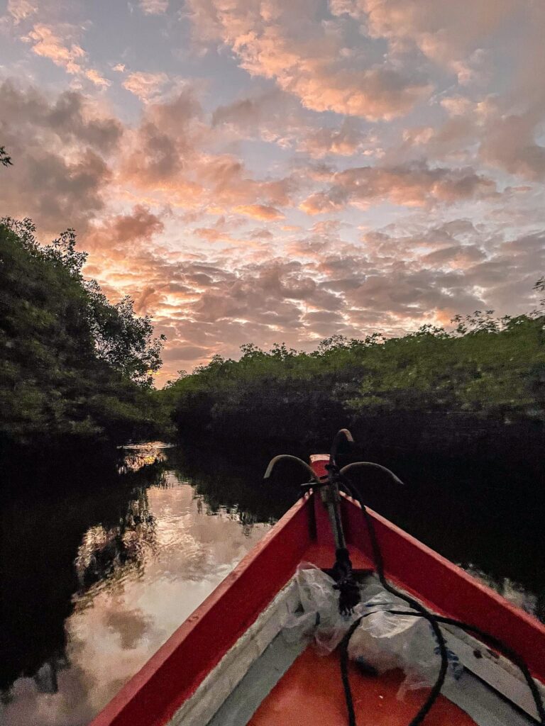 Durante o percurso, há sempre algo a aprender: como reconhecer os peixes pelo som que fazem na água, como ler as marés observando a lua, como distinguir os tipos de mangue pelo formato das raízes.